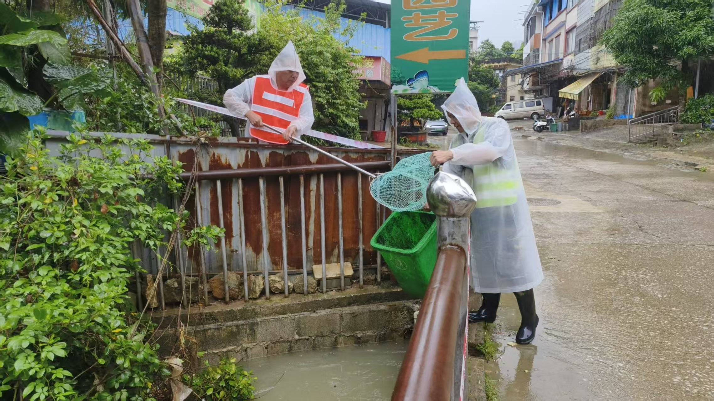 凭祥市城乡归纳执法局干部万树旺(右)于凭祥市翠竹路易涝点值守并收拾排水沟废物杂物